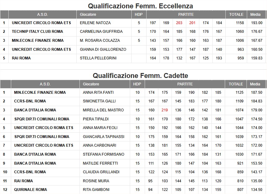 Anno | Squadra Mista | Doppio Femm. | Doppio M-Ecc. | Doppio M-Cad. | Singolo Femm. | Singolo M-Ecc. | Singolo M-Cad. | |